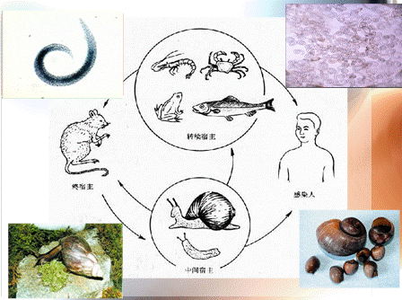 廣州管圓線蟲的終宿主主要為鼠類。成蟲寄生于黑家鼠、褐家鼠及多種野鼠等肺動脈或右心室中,雌蟲產出蟲卵,在肺毛細血管孵化出第一期幼蟲。第一期幼蟲穿過肺毛細血管隨呼吸道分泌物上行吞咽進入消化道,進而隨糞便排出體外。當中間宿主如福壽螺、褐云瑪瑙螺、蛞蝓等軟體動物食入或接觸含有第一期幼蟲的糞便時,第一期幼蟲可在其體內進一步生長發育。幼蟲在軟體動物體內蛻皮或生長發育速度與環境溫度關系密切。感染后約1周,第一期幼蟲在中間宿主組織內蛻皮,發育為第二期幼蟲,1周后再經1次蛻皮,發育為第三期幼蟲即感染期幼蟲。幼蟲寄生在軟體動物血液、內臟及肌肉,以肺內居多。淡水魚、蝦、蟹、蛙、蛇、蜥蜴等因捕食中間宿主而長期存儲第三期幼蟲,是該蟲的轉續宿主。鼠類因吞食含有第三期幼蟲的中間宿主或轉續宿主后,幼蟲鉆入腸壁,進入血管,經血循環至鼠體各個器官,其中多數是沿頸總動脈到達腦部,常寄生在大腦的前部。幼蟲到達腦部,在感染后4~6天進行第三次蛻皮后成為第四期幼蟲。在感染后7~9天,再經第四次蛻皮成為幼齡成蟲。幼齡成蟲大多于感染后24~30天,經靜脈系統至右心,又從肺動脈到達肺部。幼蟲被鼠吞食至發育為成蟲需42~45日。