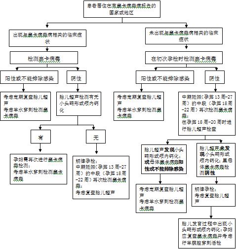 ① 確診寨卡病毒感染或不能除外感染:應開展胎兒超聲檢測,如發現胎兒存在或顱內鈣化,則可根據孕周考慮行羊膜腔穿刺活檢檢測寨卡病毒;如超聲未發現異常,仍推薦在孕檢時定期開展胎兒超聲檢查。
