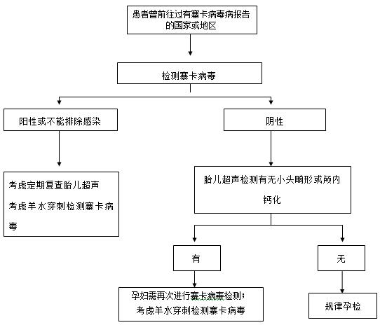 ② 寨卡病毒檢測陰性:仍建議在孕檢時進行超聲檢查除外胎兒小頭畸形或顱內鈣化,如超聲顯示有上述任一異常,則孕婦應重新進行寨卡病毒檢測,并根據孕周考慮行羊膜腔穿刺活檢檢測寨卡病毒;如未發現異常,則推薦進行規律孕檢。