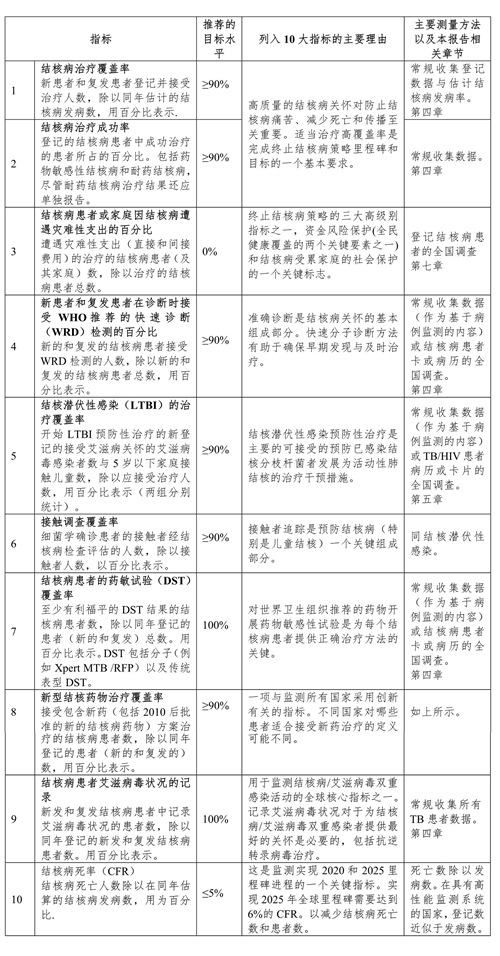 世界衛(wèi)生組織確定了10個主要指標(biāo),監(jiān)測實施終止結(jié)核病策略的進程,詳見表1。該表還指明了本報告的特定章節(jié),可以找到每個指標(biāo)的可用數(shù)據(jù)。