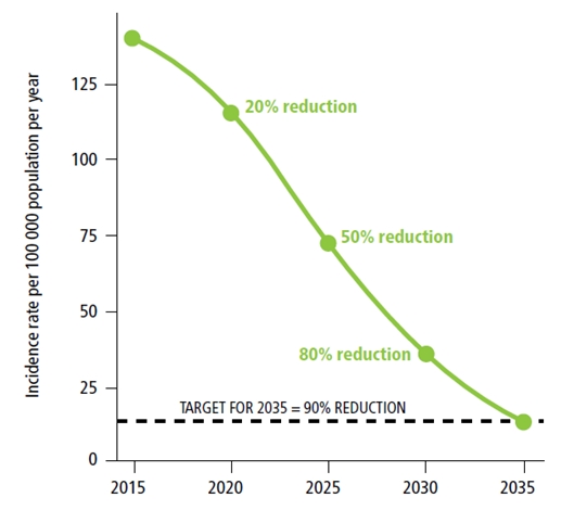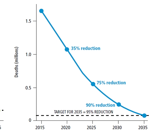 總的目標(biāo)是“終止全球結(jié)核病流行”,并有三個高層次的總體指標(biāo)和相關(guān)目標(biāo)(2030年和2035年,與可持續(xù)發(fā)展相關(guān)的指標(biāo))和里程碑(2020年和2025年)。這三個指標(biāo)是: