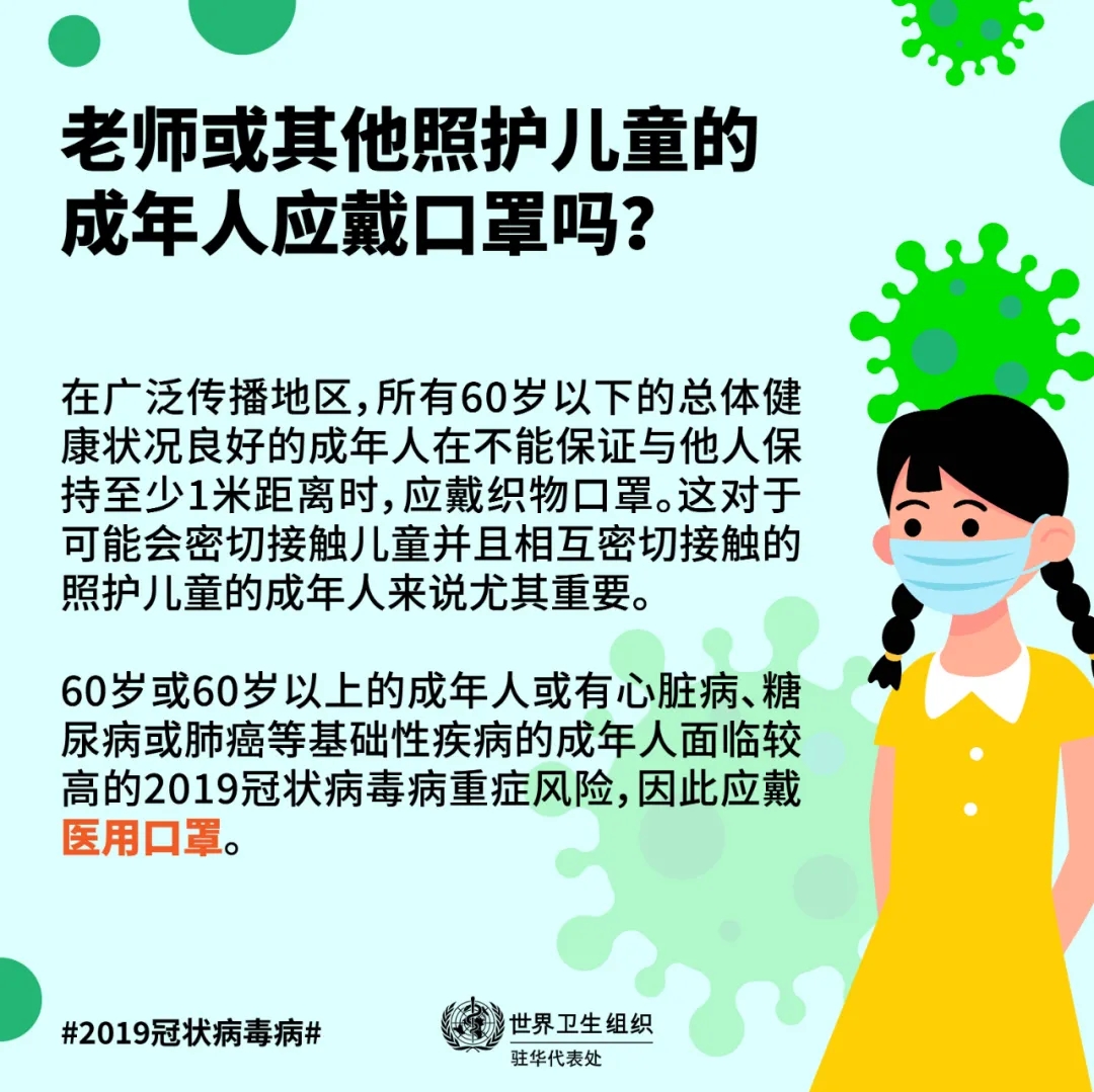 世衛組織和聯合國兒童基金會建議,尤其在無法保證與他人保持至少1米距離,并且當地存在廣泛傳播問題的情況下,12歲及12歲以上兒童應佩戴口罩,其佩戴口罩的條件與成年人相同。