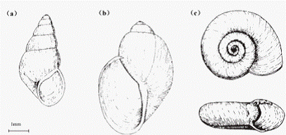(a):釘螺;(b):水泡螺;(c):雙臍螺
