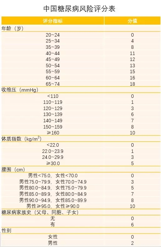 從年齡、血壓、體質指數、腰圍、家族史、性別六方面按不同程度進行評分(詳見下表1),六個分值進行合計。